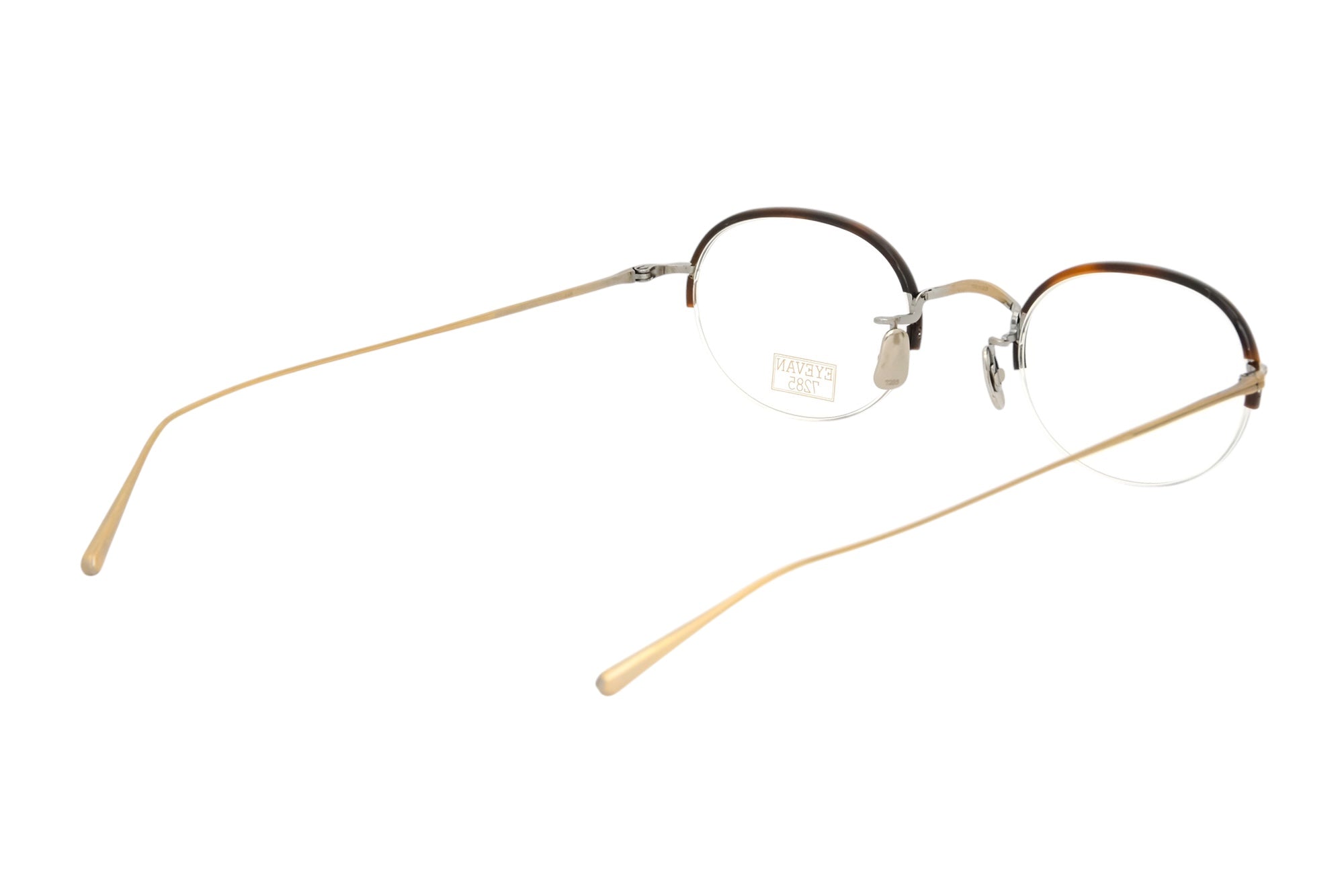 90年代によく見られた天地幅の狭いオーバルシェイプがイメージソース。フロントリム上部はセル巻きでカバーしたこだわりの意匠。ナイロールリムとセル巻きを同寸法にし、穴位置を合わせたこの構造はミニマルなルックスに対して非常に難易度が高い製法である。