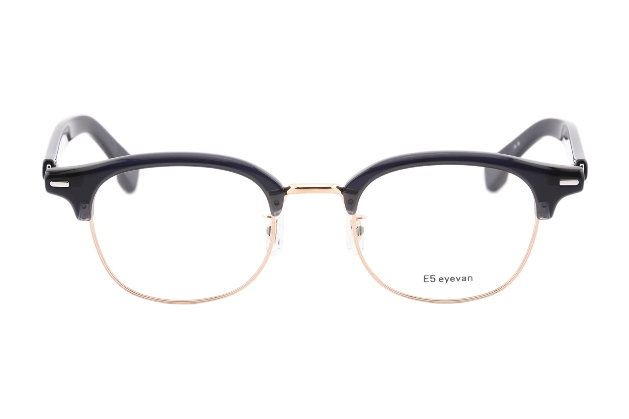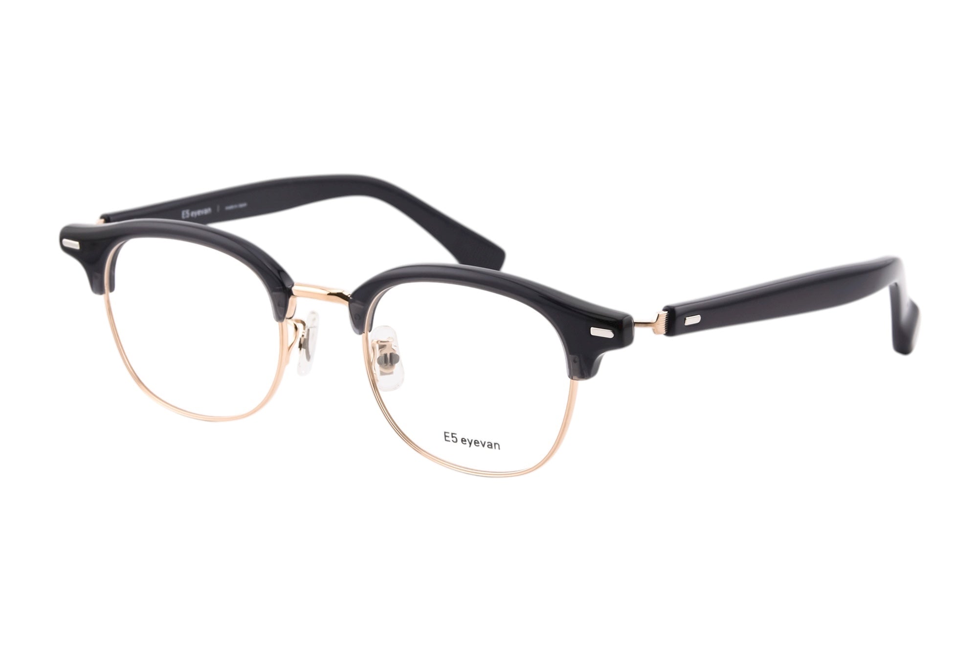 E5 eyevan初となるサーモントフレーム。フロントは高密度で変形が少なく、人体からの影響、経年変化がしにくい特殊なプラスチックであるHighcount acetateを使用し、軽量かつ強度のあるチタン製のリム、ブリッジで組み上げた。