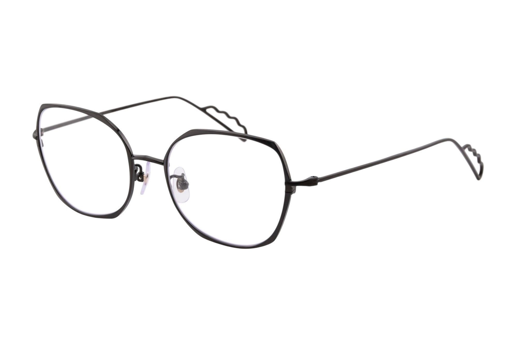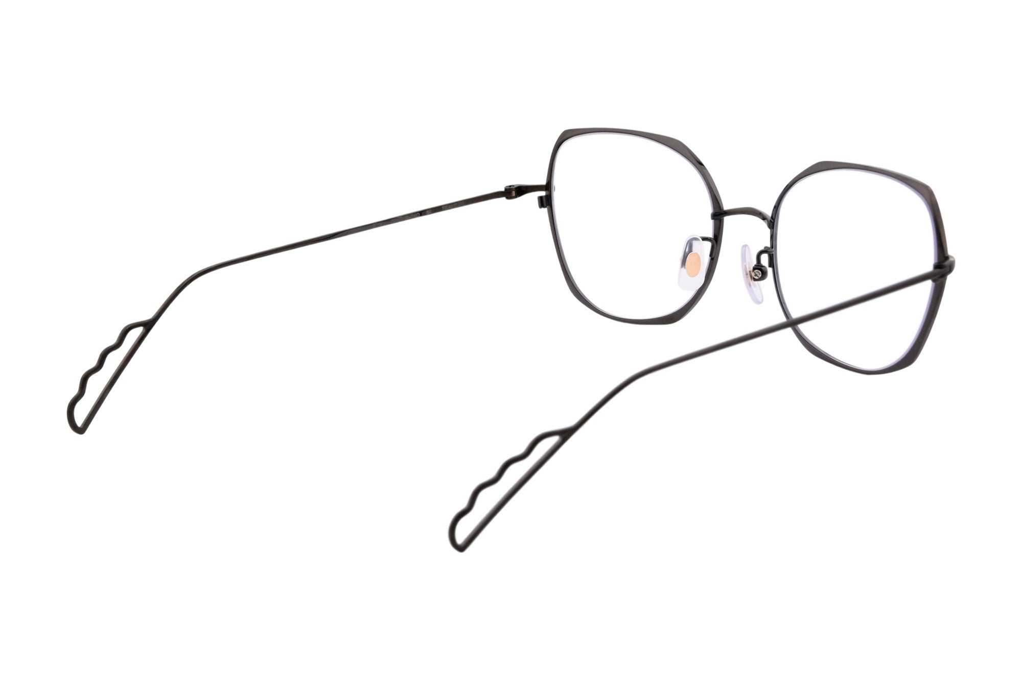 フロントリムは、一般的なリム線ではなく、一枚のチタン材を立体的に打ち抜いたカットリムを用いているため、多面的なカットが際立った仕上がりに。ソリッドな印象を持つカットリムを、メガネアンドミーらしいデザインでモードな雰囲気に。