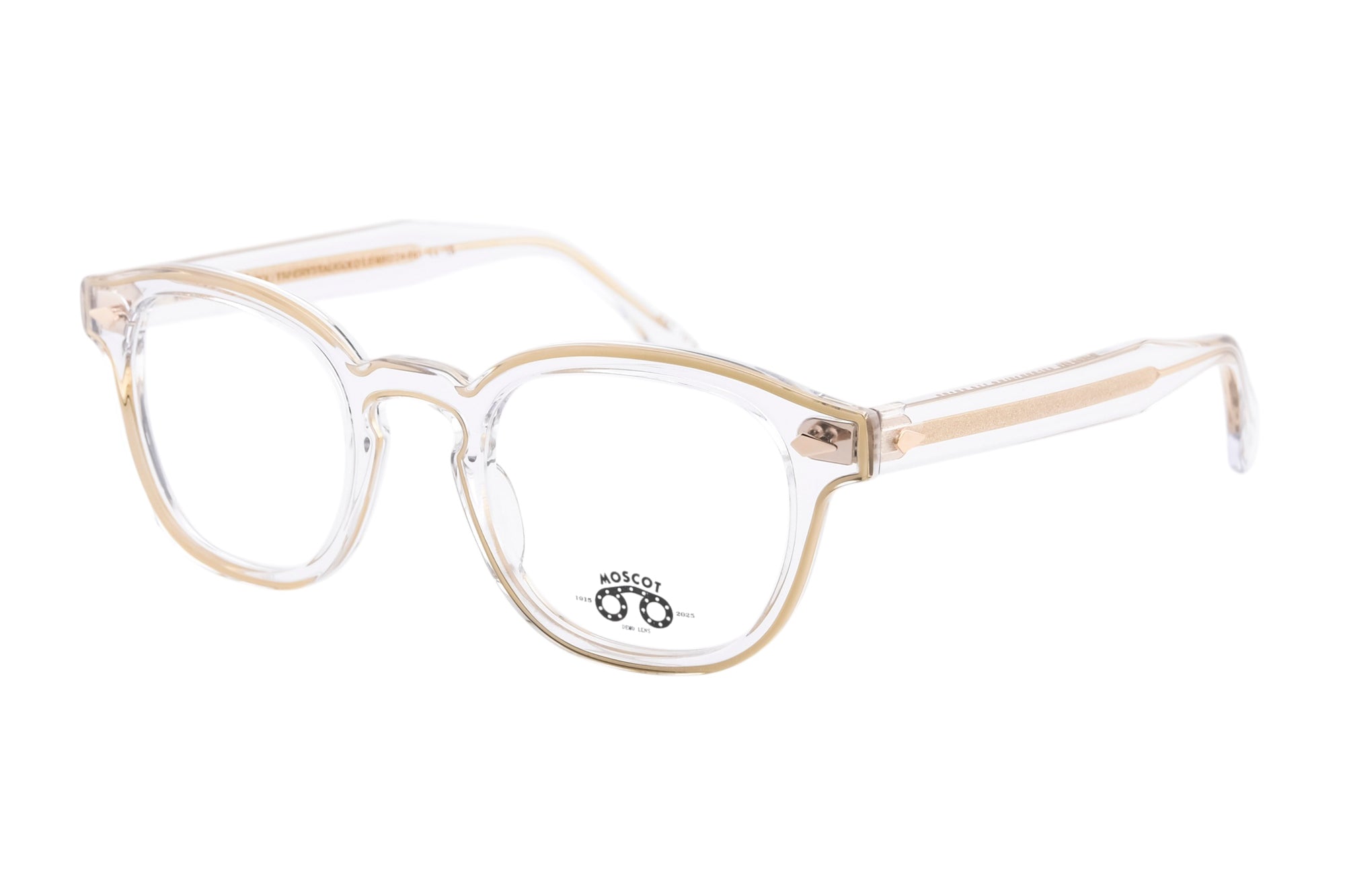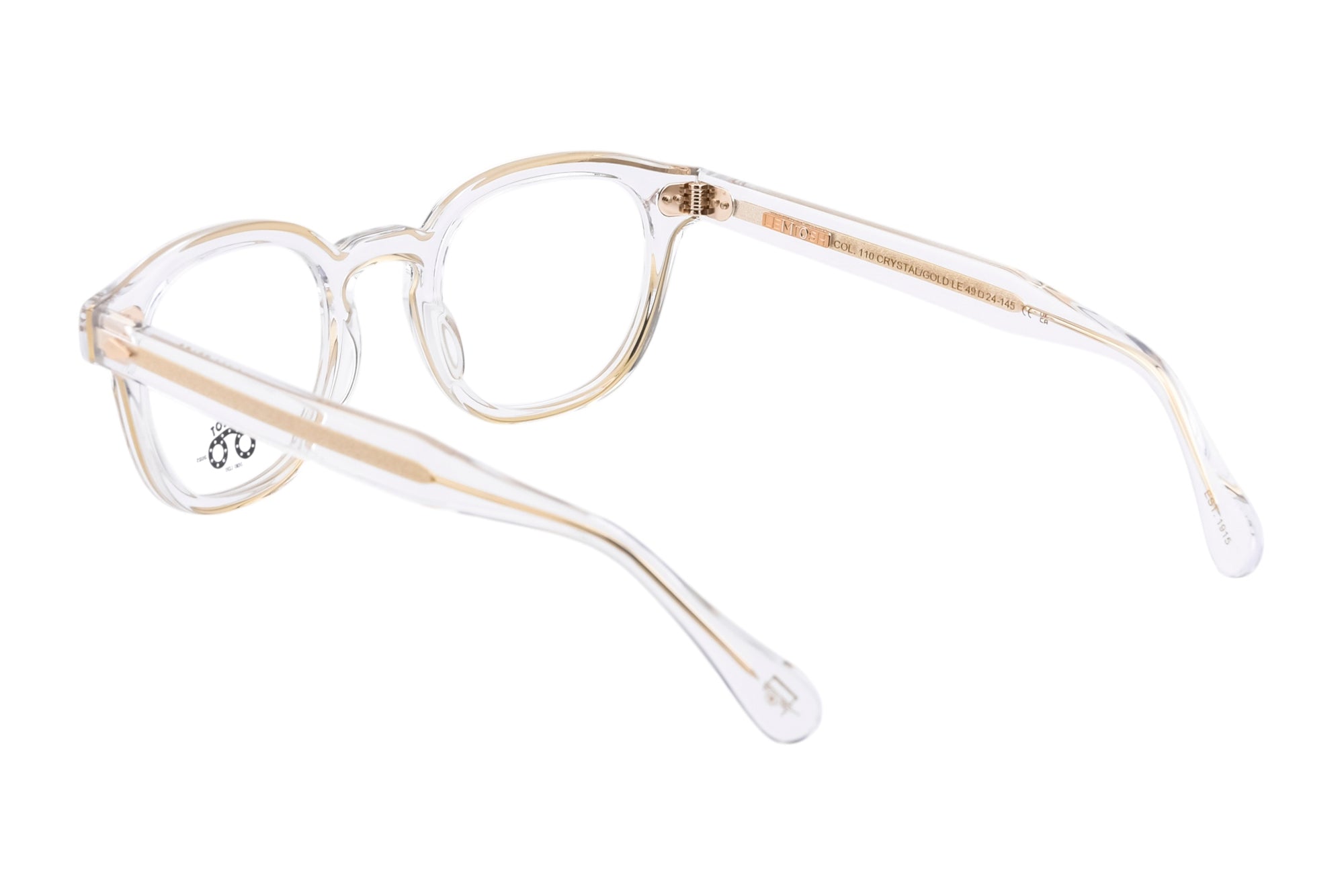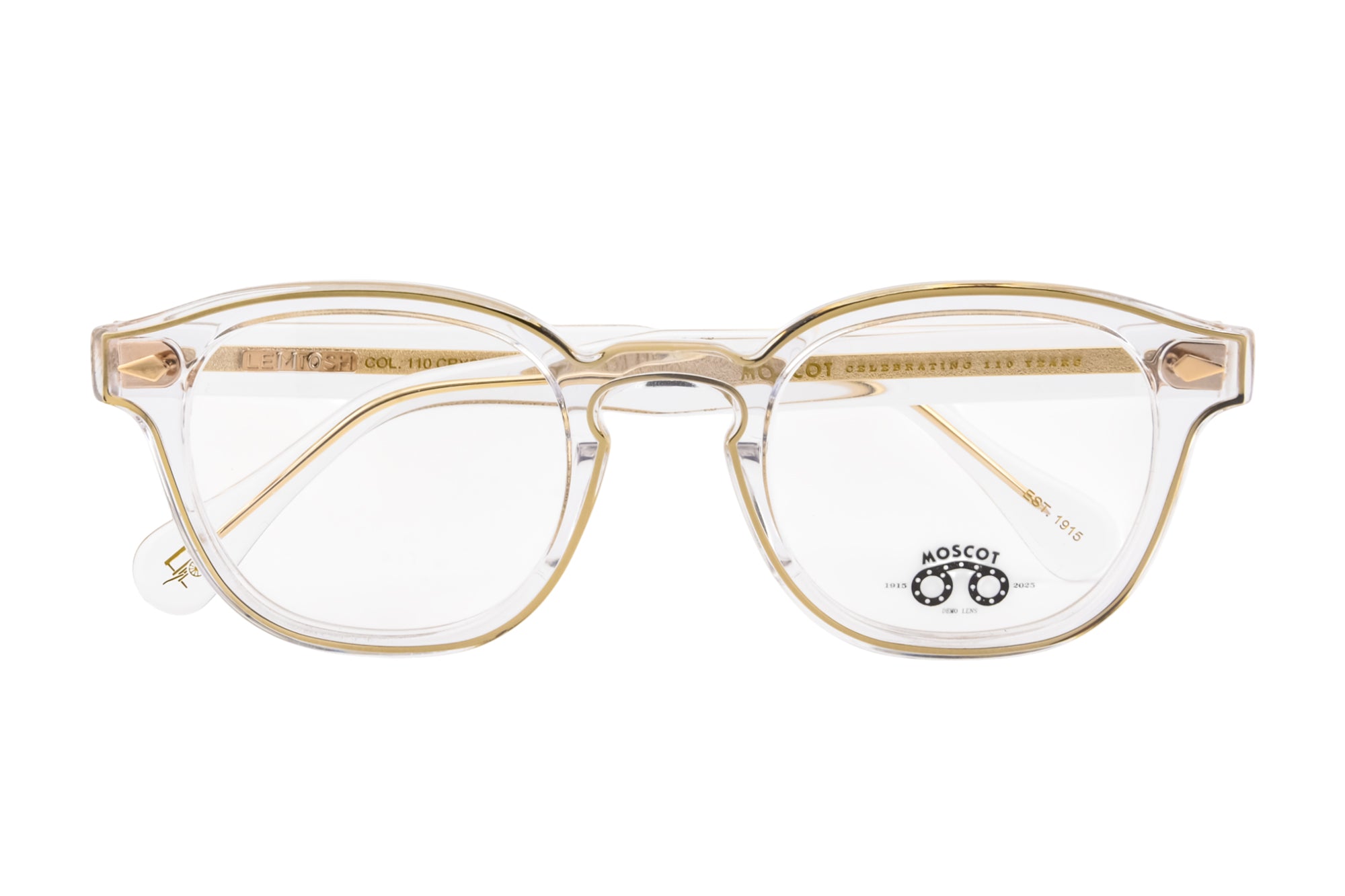 クリアフレームのシルエットに沿って、ゴールドのワイヤー(メタルパーツ)が封入されたスペシャル仕様。テンプルにはカスタムゴールドのLEMTOSH 110プレートがあしらわれ、ブランドの節目の年を表す「110」の文字が隠されています。