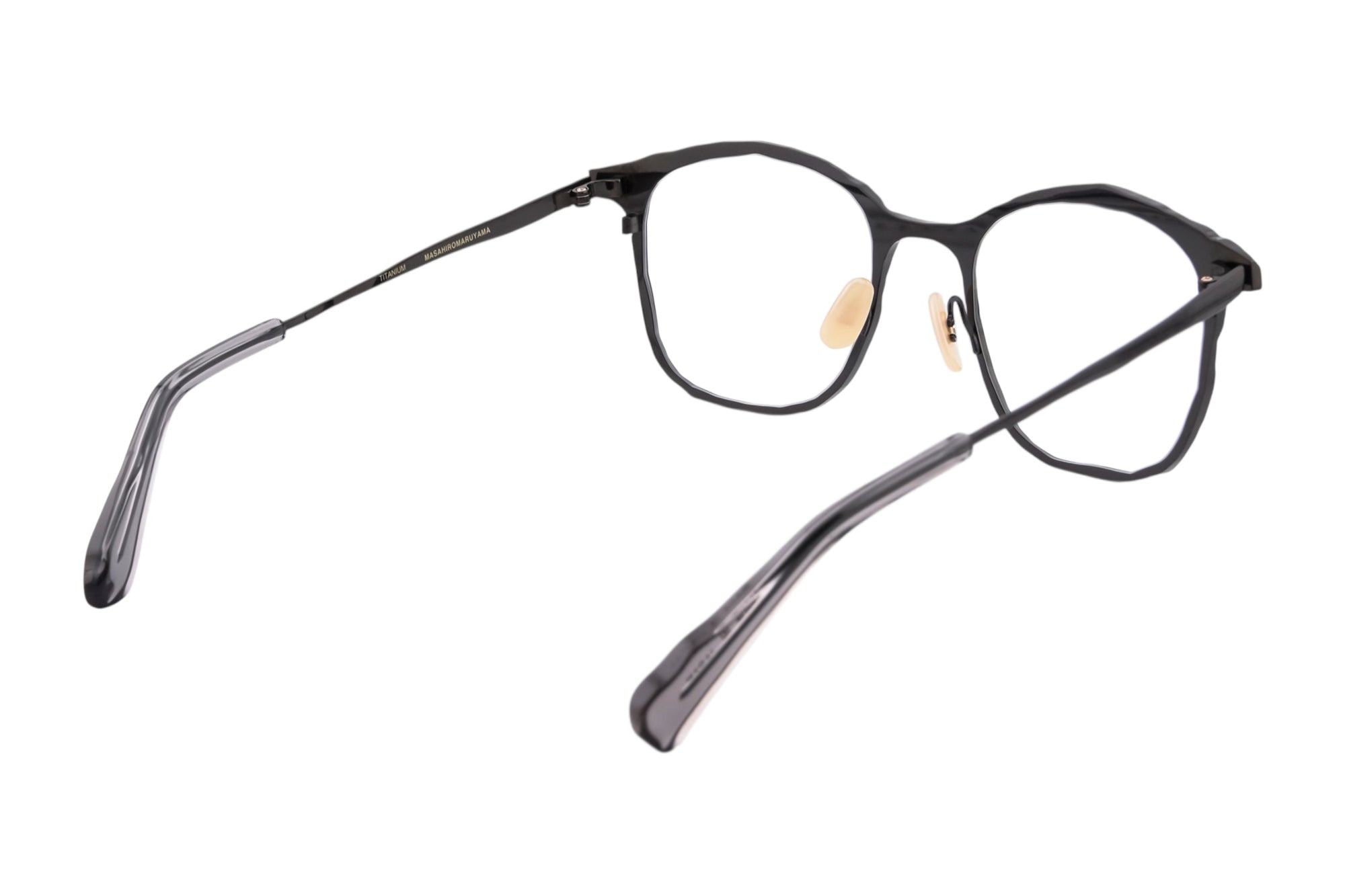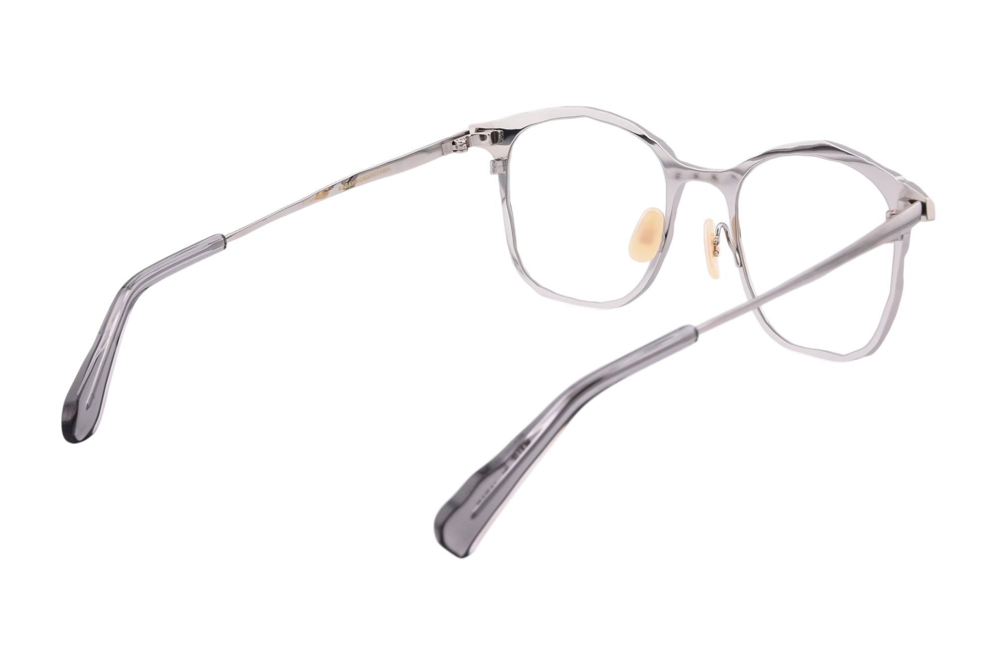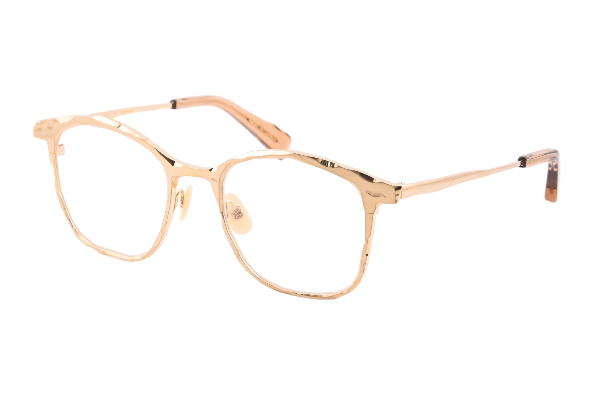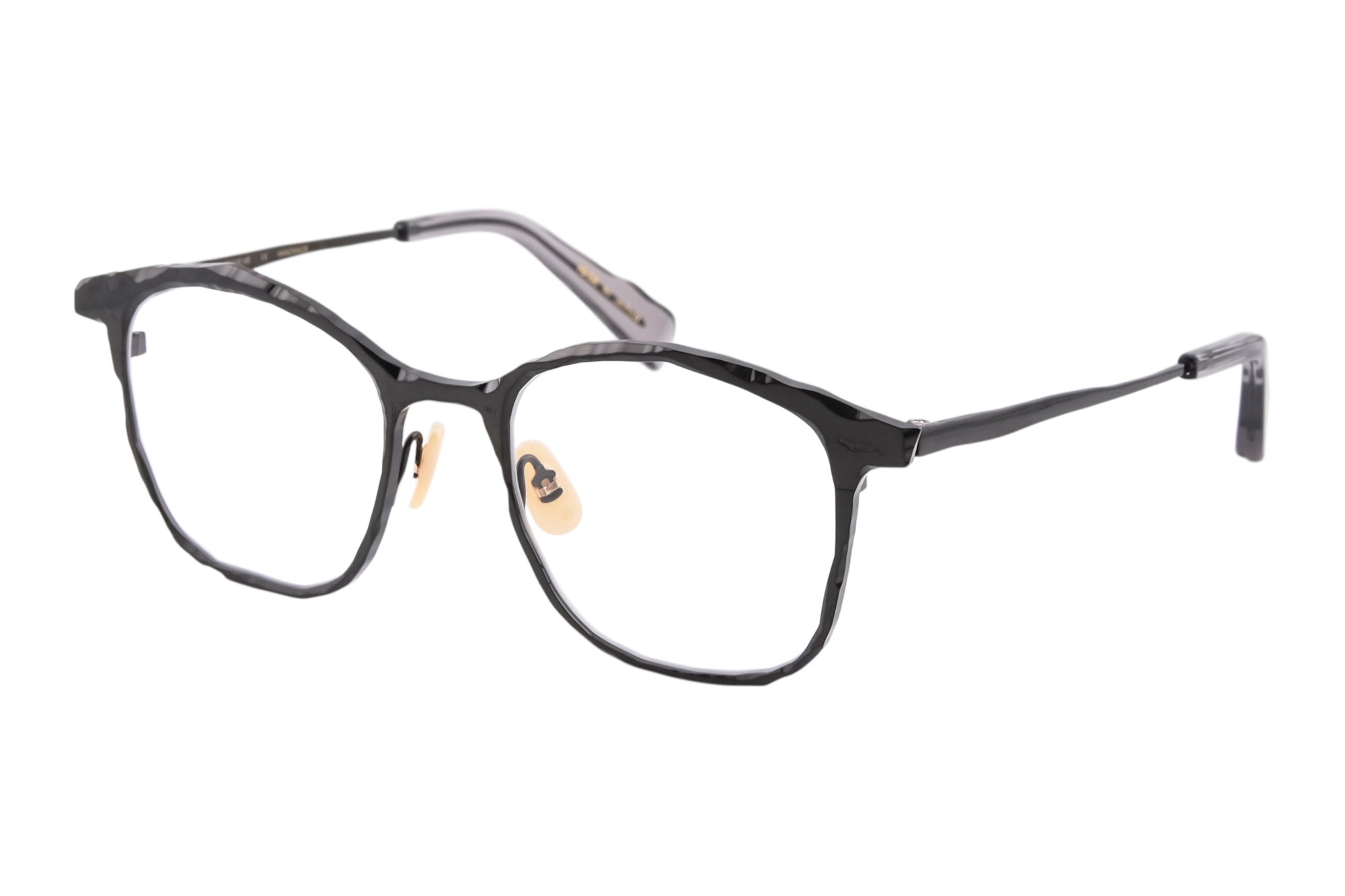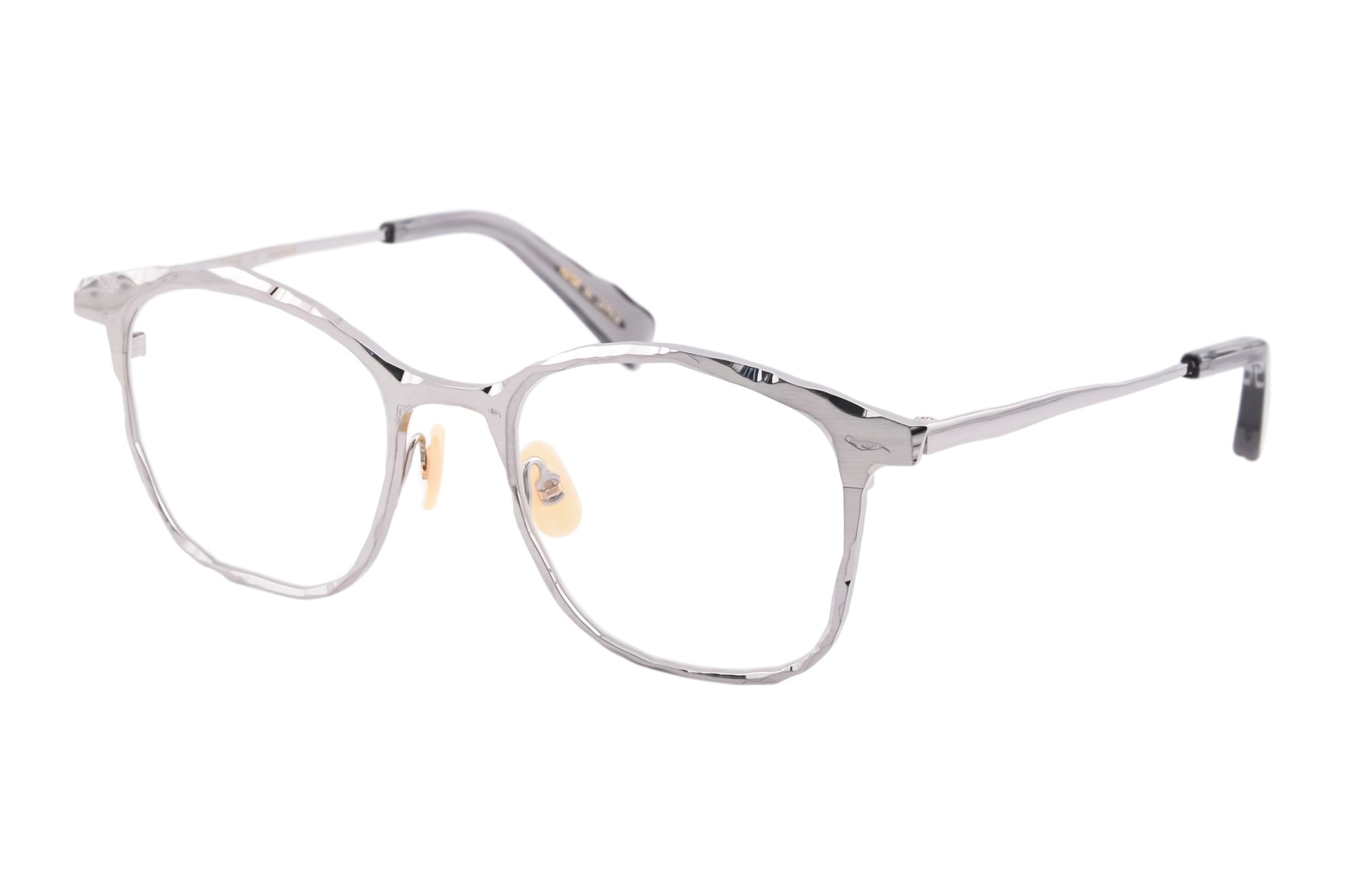 荒々しく削り出したような切削痕をデザインに落とし込んだメタルフレーム。重厚な佇まいが魅力のウェリントンシェイプのモデル。