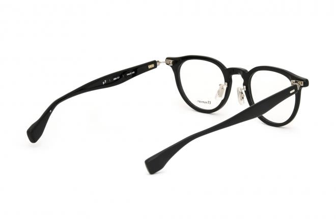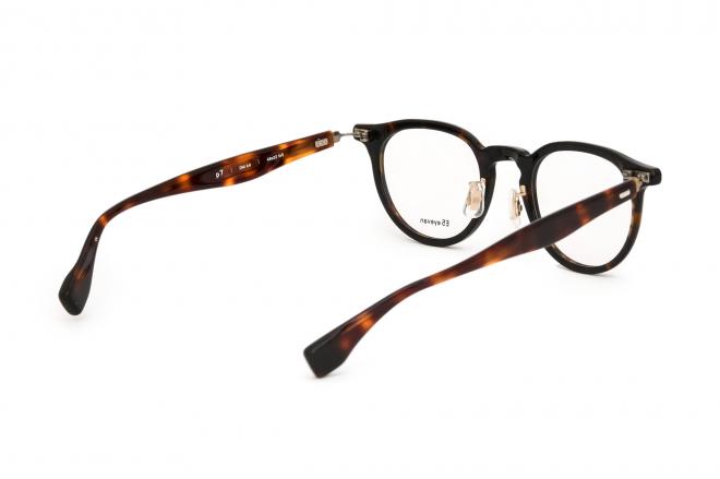 EYEVANのデザインらしい、上面がややフラット気味の端正な佇まいのボストンシェイプのモデル。フロントには高密度で変形が少なく、人体からの影響、経年変化がしにくい特殊なプラスチックであるHighcount acetateを使用している。