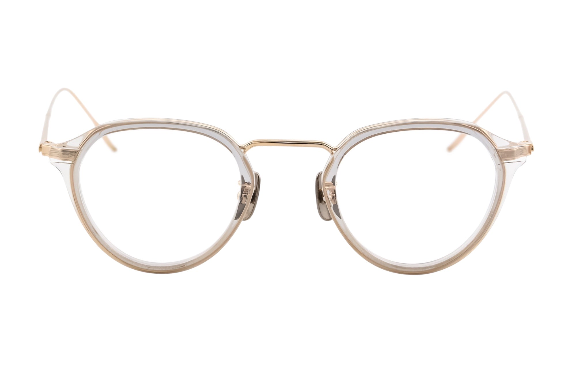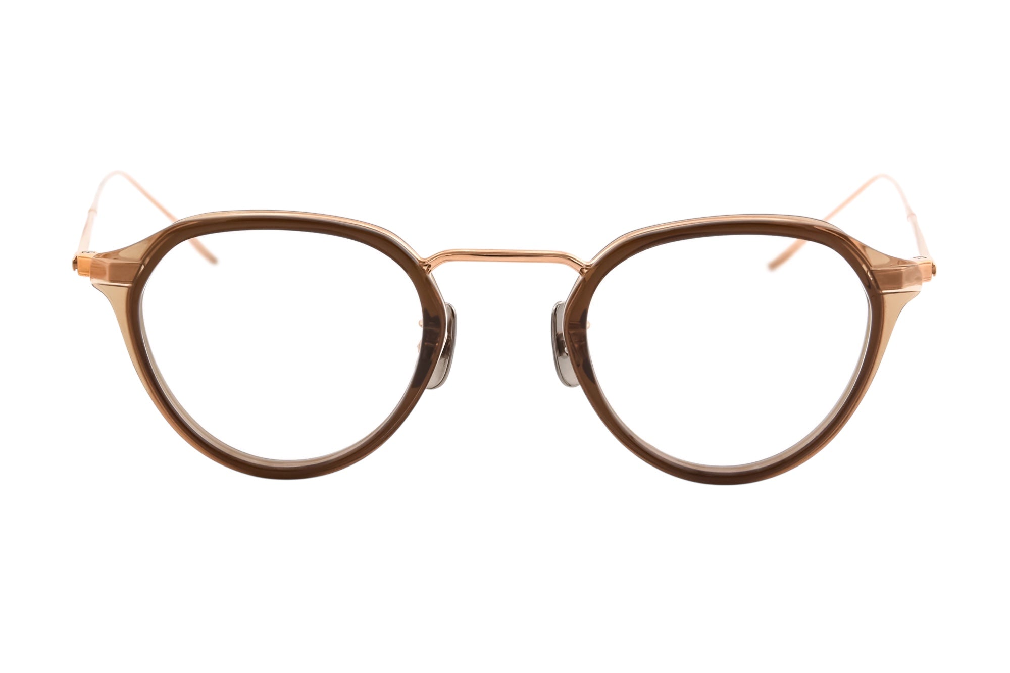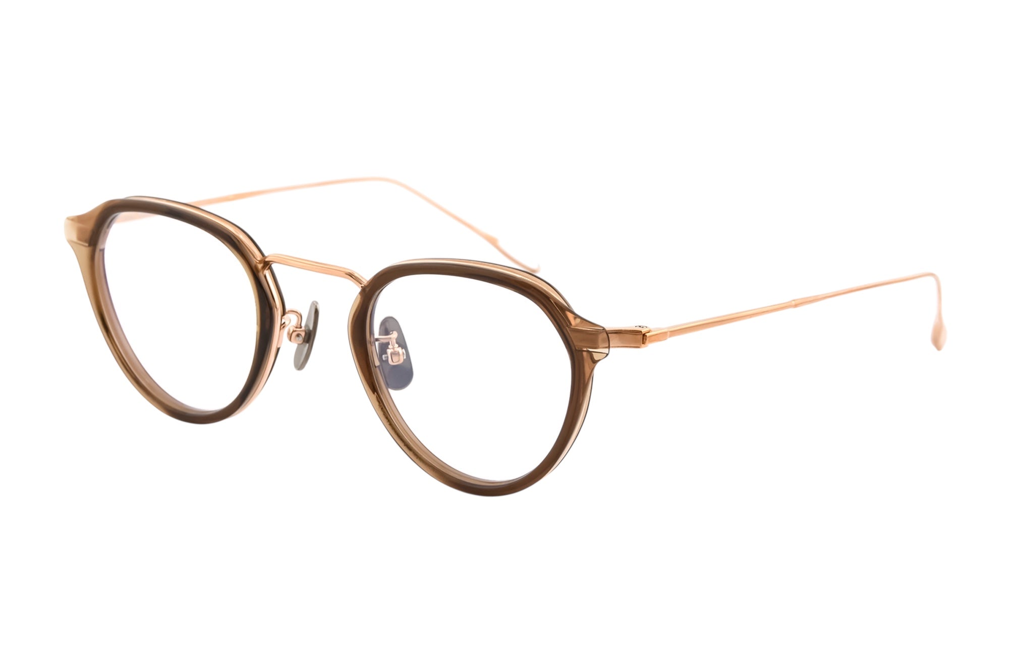 レンズ形状とアセテートリム形状にギャップを持たせたクラウンパントのコンビネーションフレーム。テンプルにつながるヨロイにアセテートリムをかぶせることでアセテートの存在感を高めたモデル。