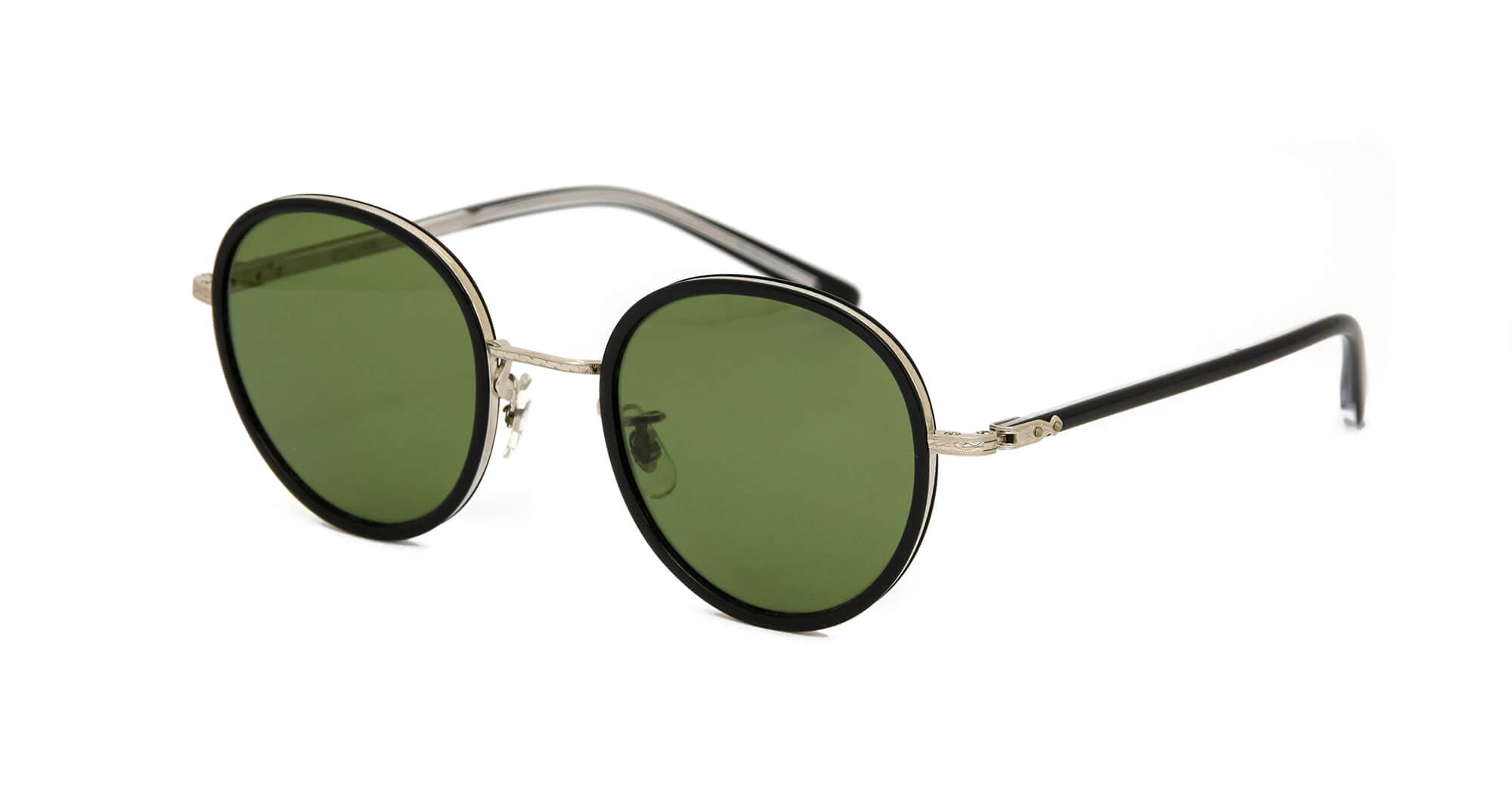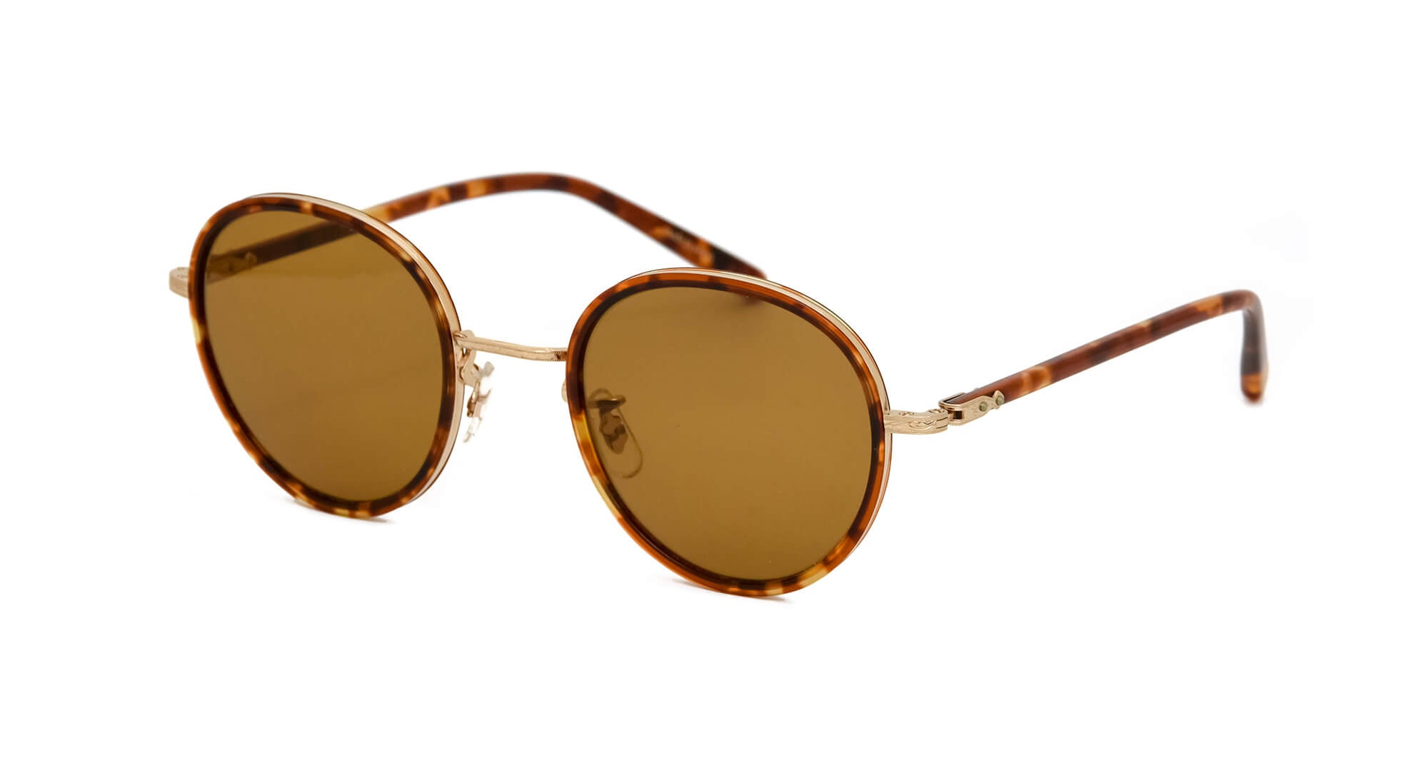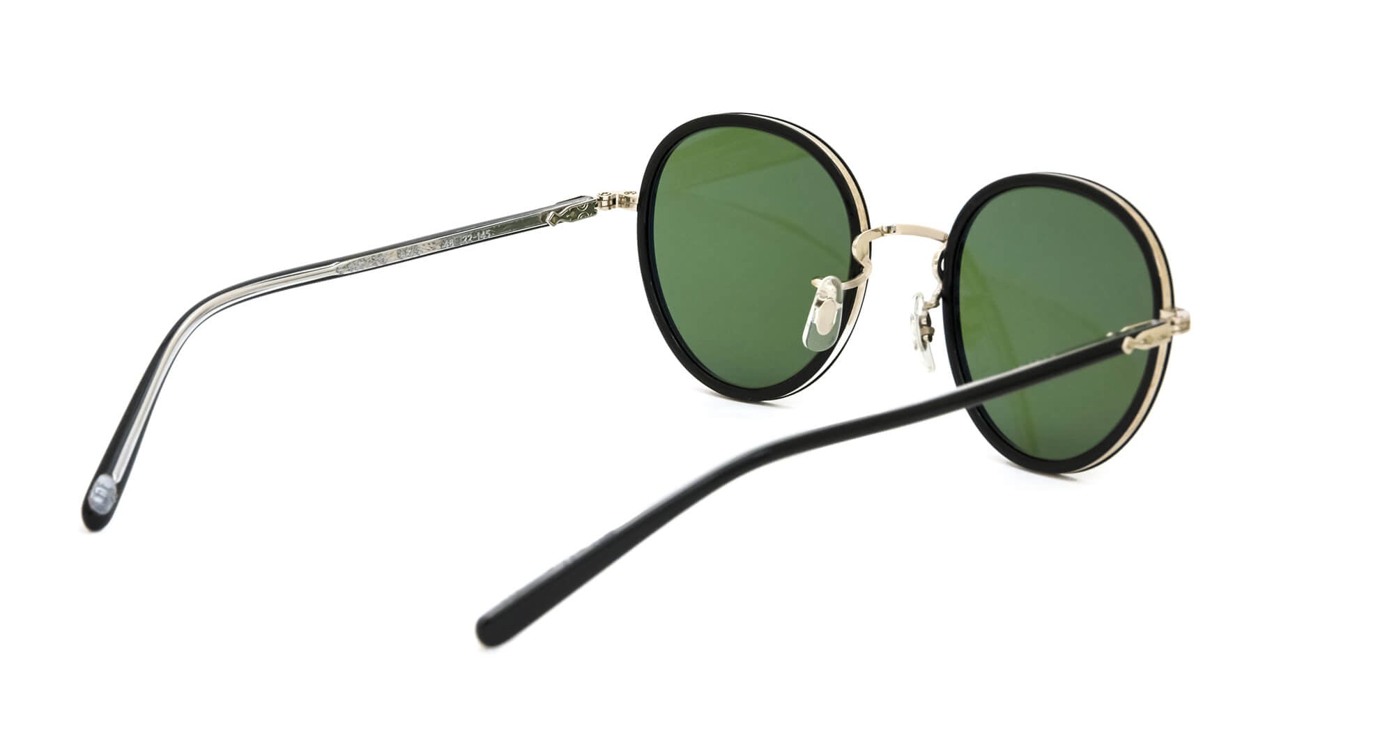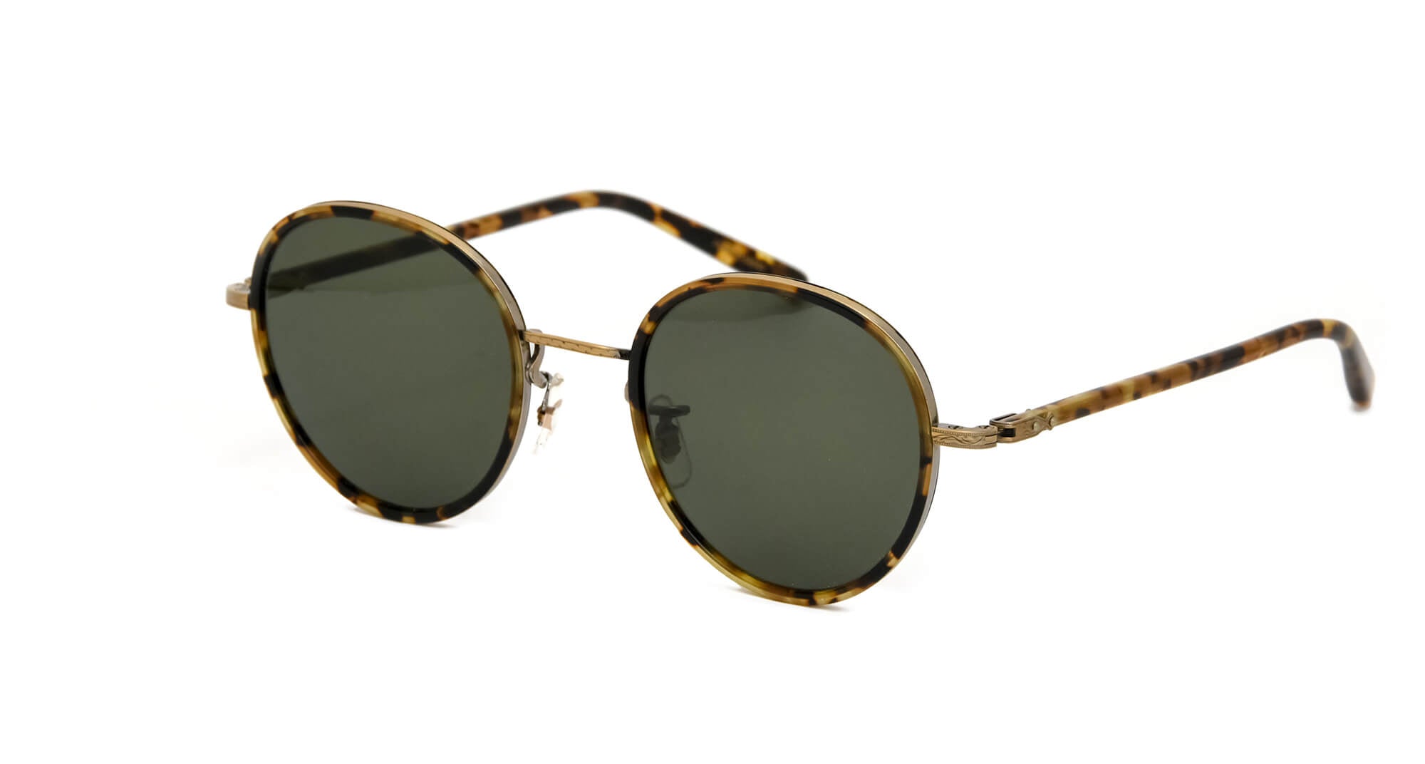 当時のデザインをもとにアセテート枠をメタルリムで巻き込むソフト枠と言われる手法で再現したフレーム。ブリッジ、ヨロイ(フロント両端とヒンジとの接合部)、テンプル芯などの金属パーツは、元のデザインに忠実に型から作り直し、軽さと強度に優れるチタン製にアップグレードされている。サングラスはイタリア製の最高級ガラスレンズを使用している。