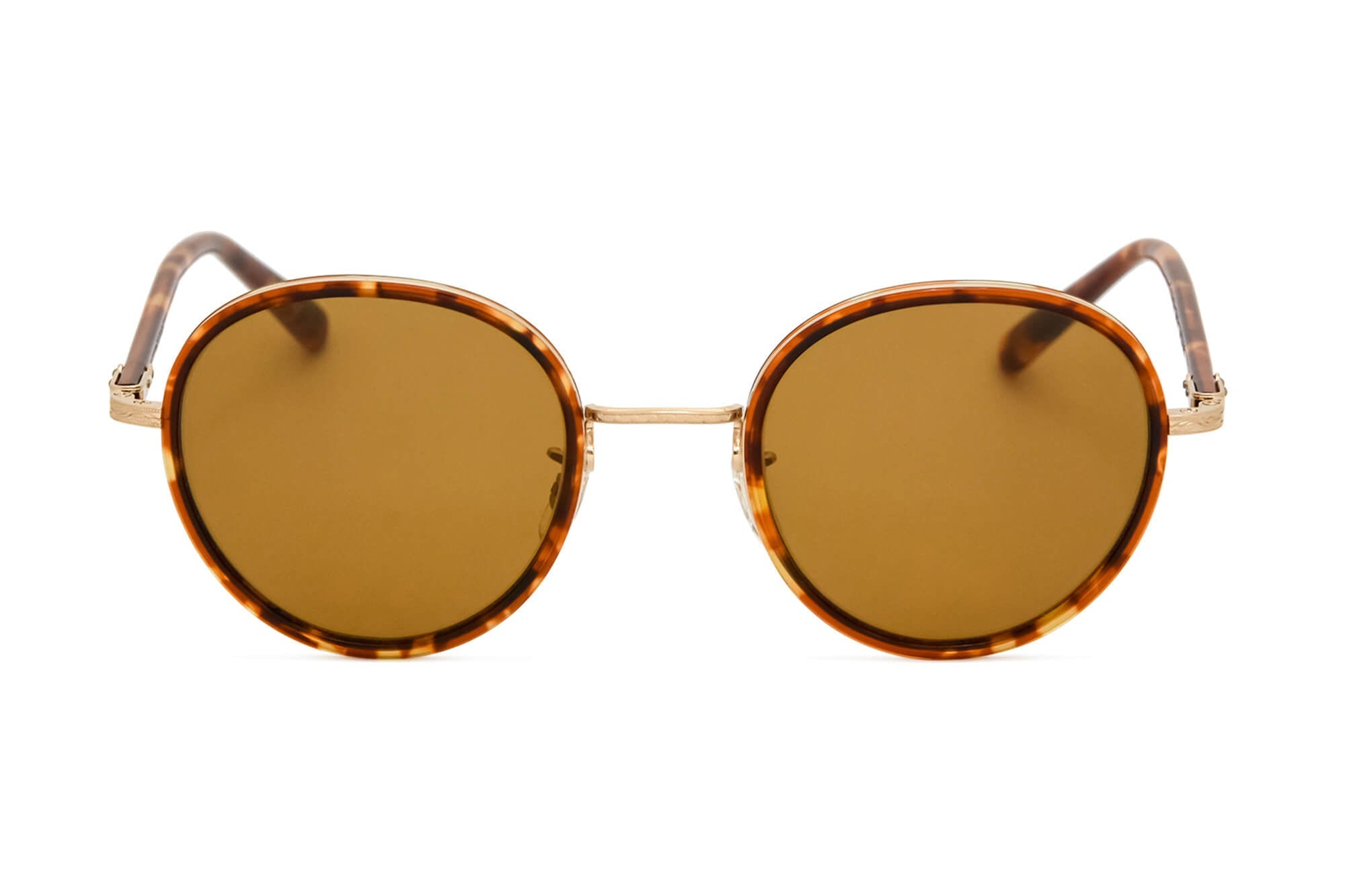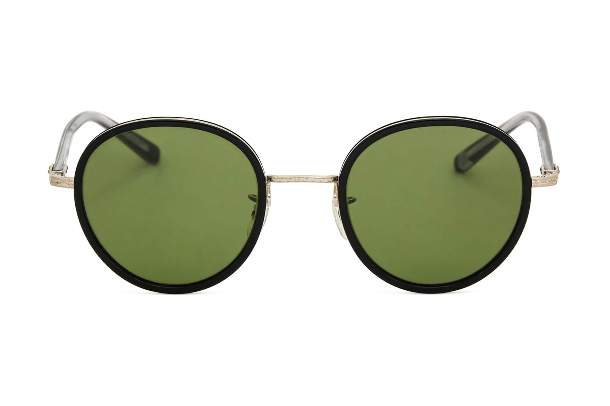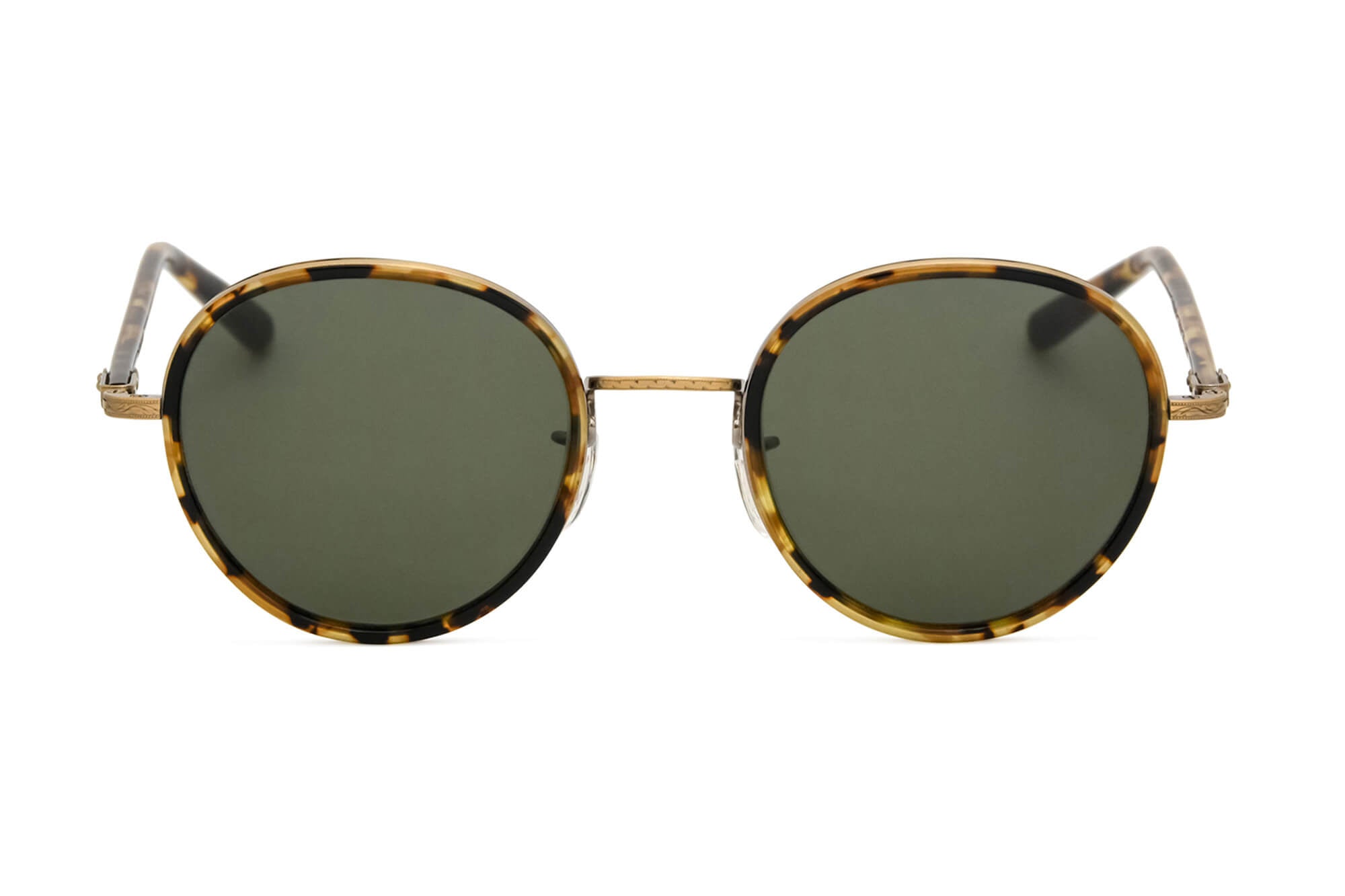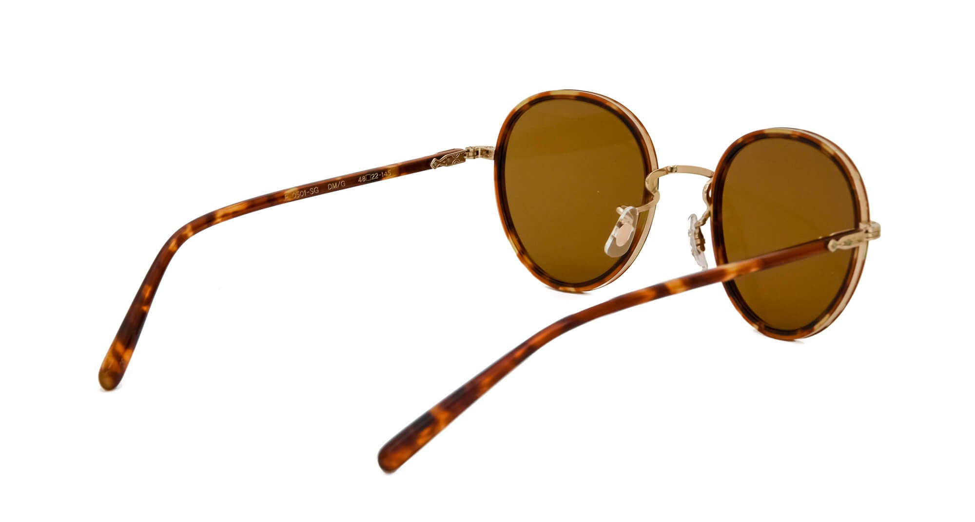 当時のデザインをもとにアセテート枠をメタルリムで巻き込むソフト枠と言われる手法で再現したフレーム。ブリッジ、ヨロイ(フロント両端とヒンジとの接合部)、テンプル芯などの金属パーツは、元のデザインに忠実に型から作り直し、軽さと強度に優れるチタン製にアップグレードされている。サングラスはイタリア製の最高級ガラスレンズを使用している。