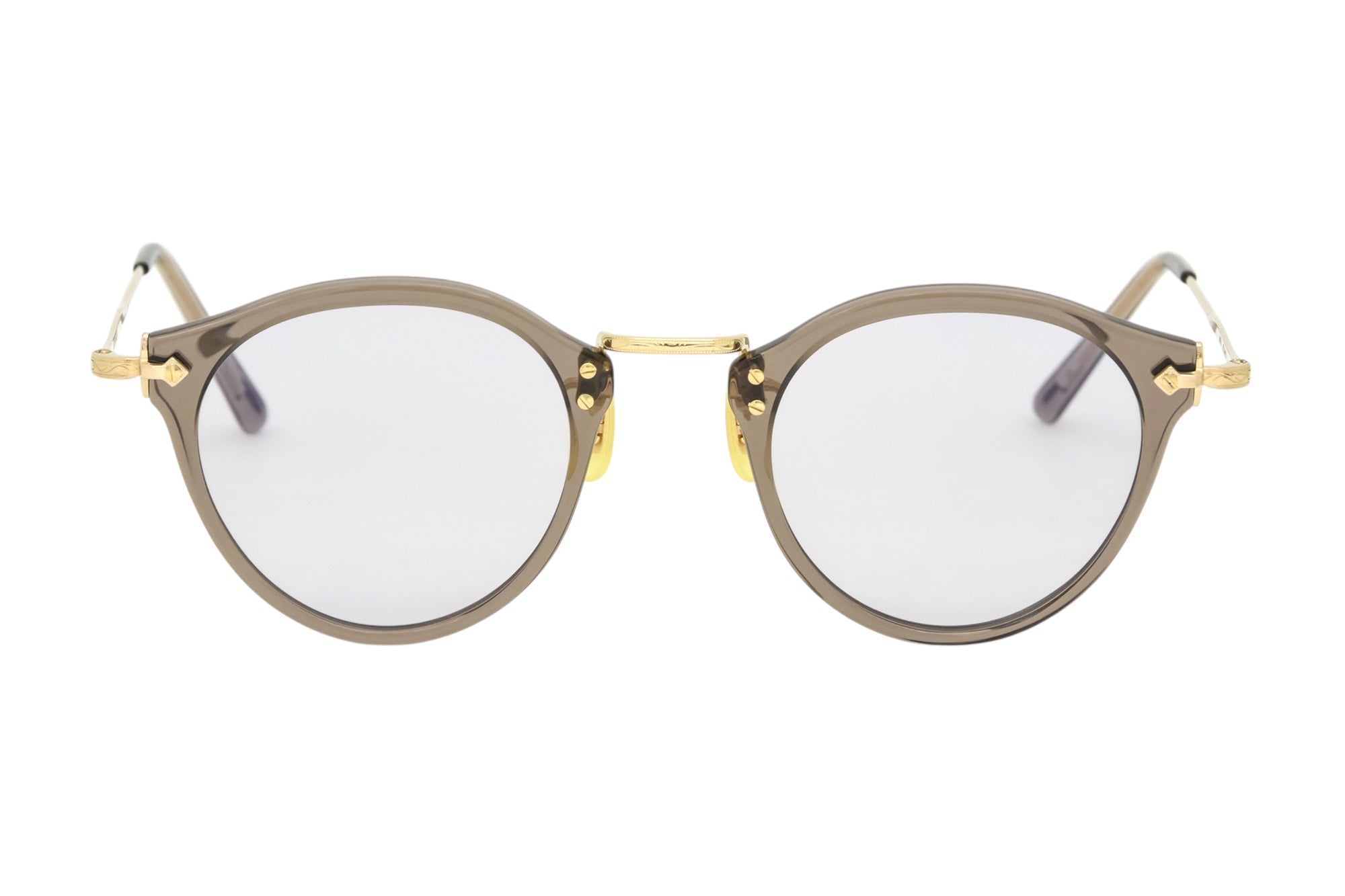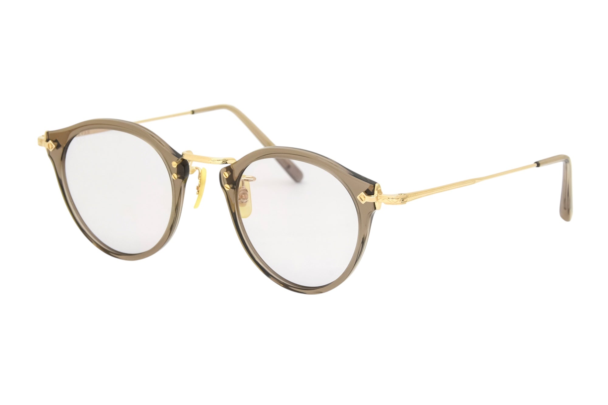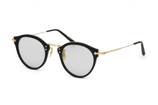 ボストン型のプラスチック製リムを、ノーズパッドとブリッジが一体型となっているマンレイブリッジと特徴的なデザインのヨロイパーツで構成したコンビネーションフレーム。