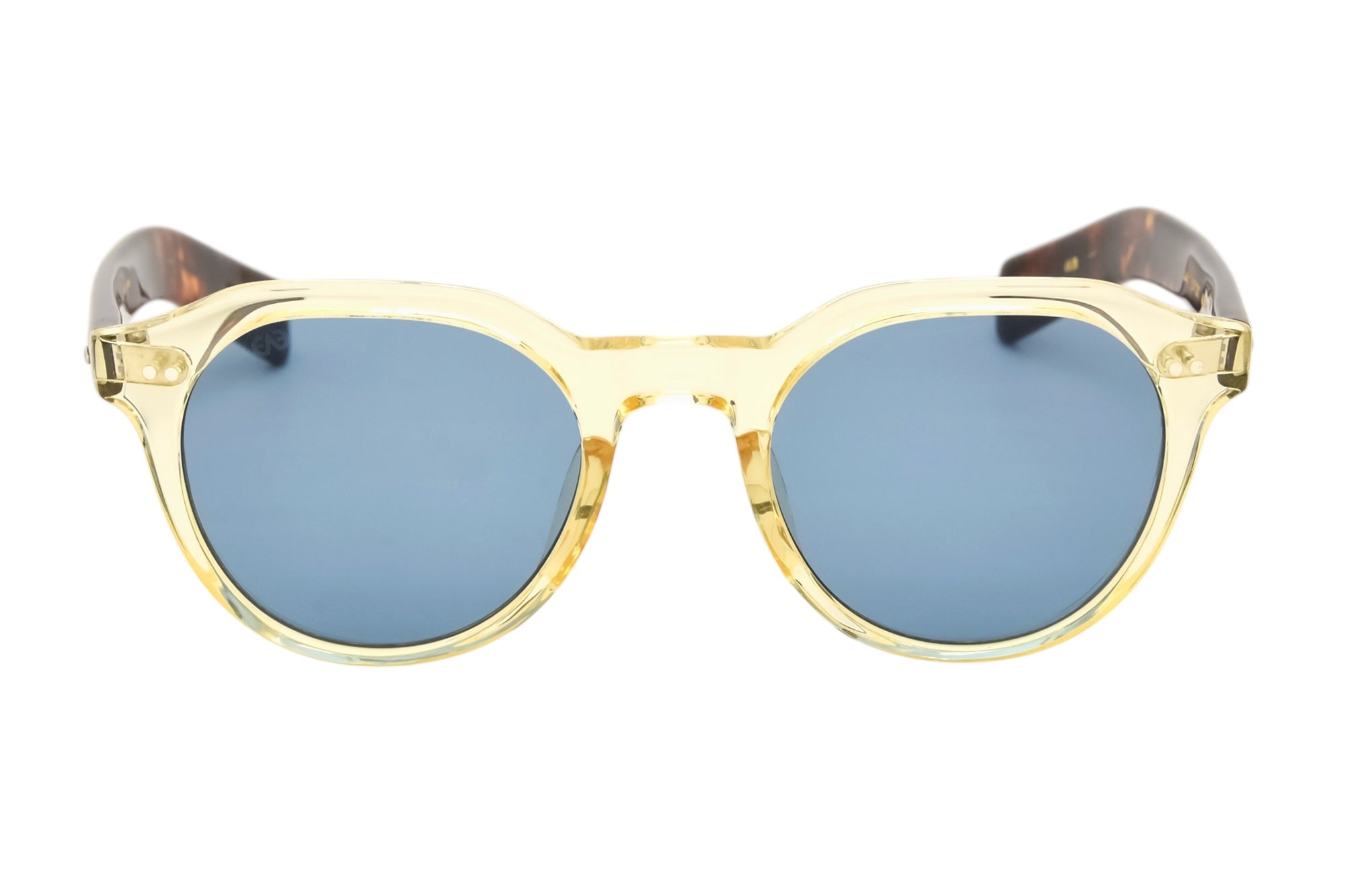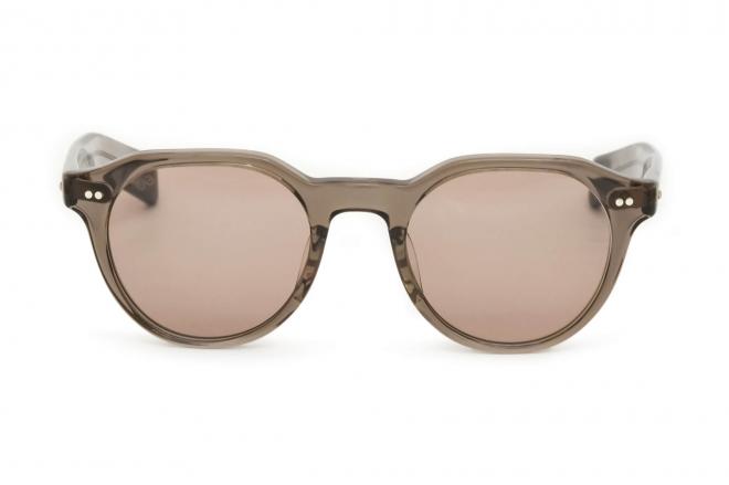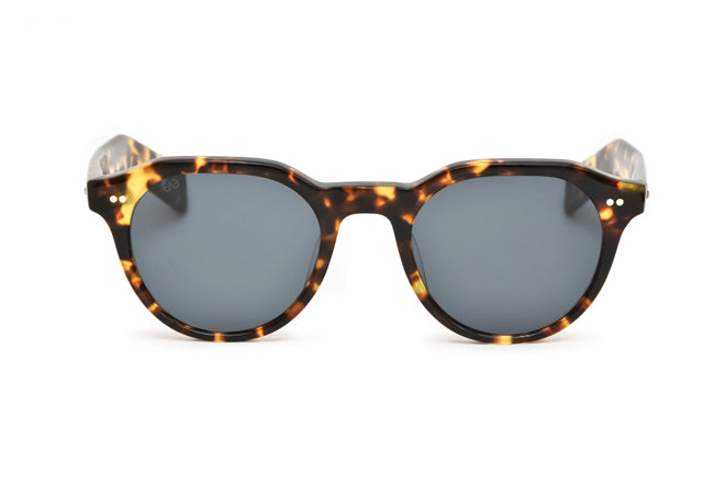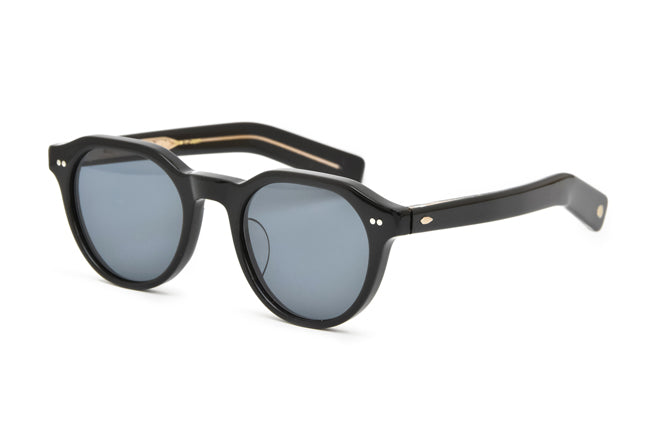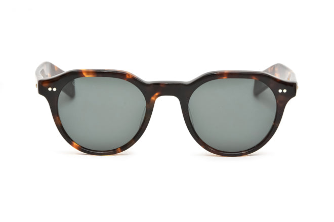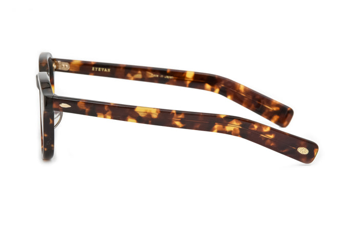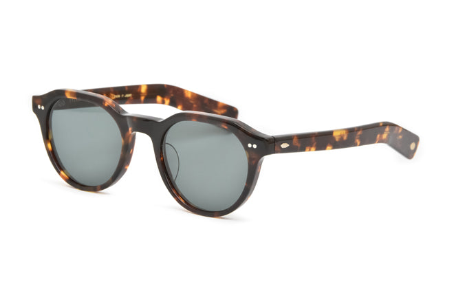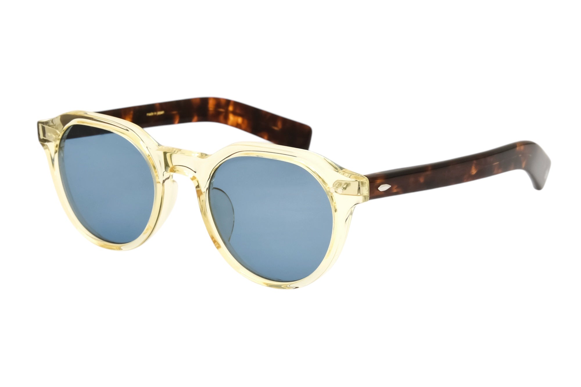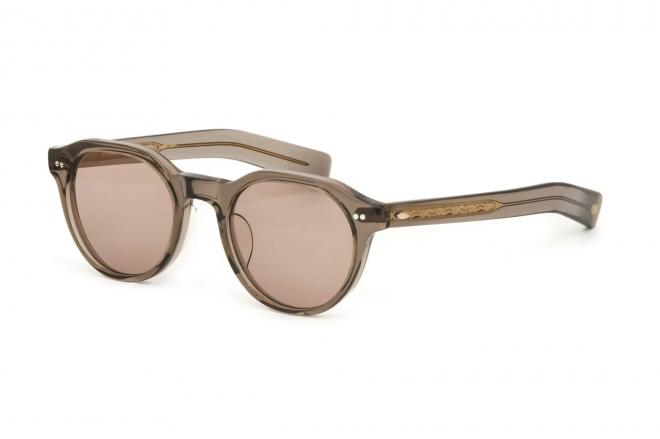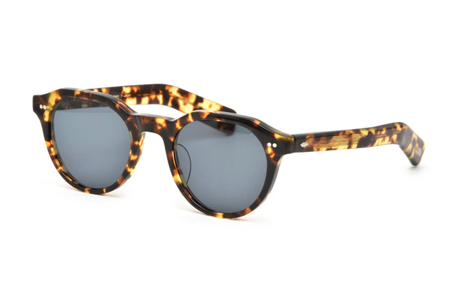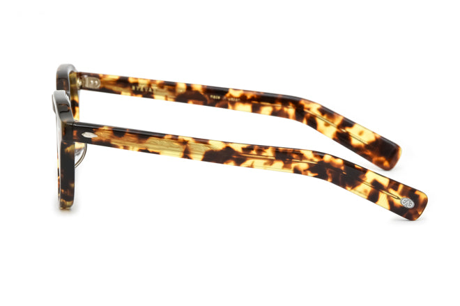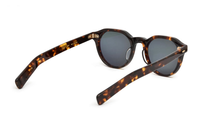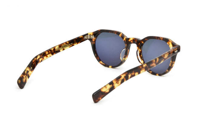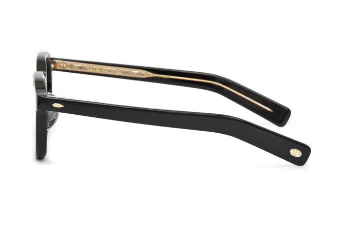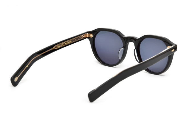 6mm厚の生地を使用したクラウンパント(王冠)型のフロントに、2ピン丁番を採用したプラスチック製のサングラス。テンプルにはオリジナルの柄を両面に彫り込んだ芯を採用。