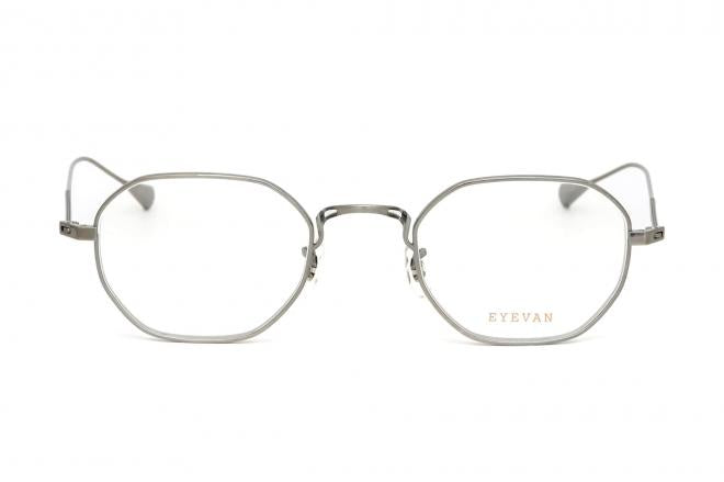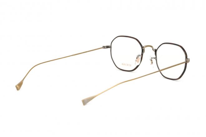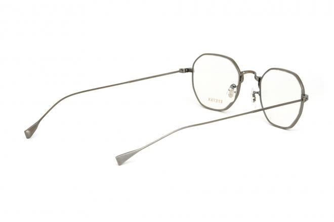 インダストリアルデザインからの発想によるヨロイ (フロント両端とヒンジとの接合部)のデザインが特徴的な、オクタゴンシェイプのメタルフレーム。