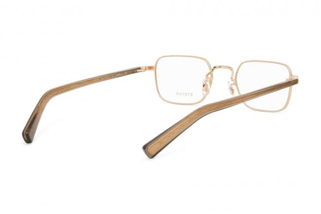 左右別々に彫金されたテンプル芯をアセテートの中に包み込んだテンプルが特長のメタルフレーム。やや高い位置にあるブリッジと変形のペンタゴンシェイプがヨーロッパヴィンテージの雰囲気を醸し出している。
