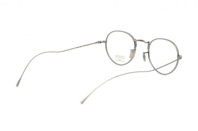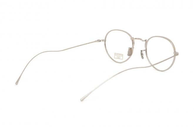 側頭部へ向かい徐々に位置が高くなるテンプルデザインは2023SSモデル「347」の系譜を組む。フロントリム、ブリッジ、テンプル各パーツに彫金が施されている見た目にも美しいメタルフレーム。