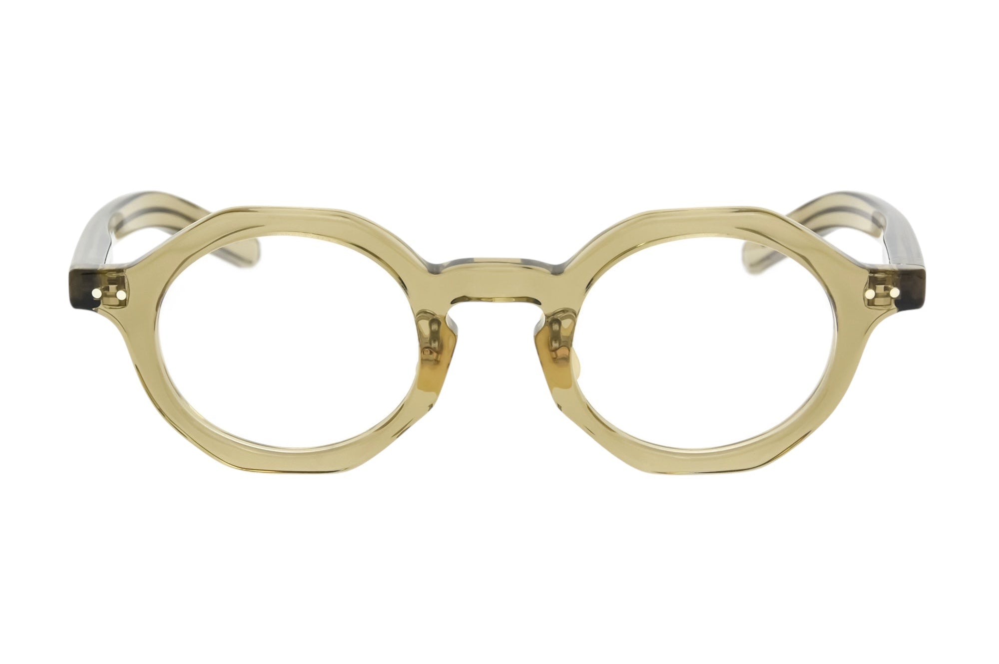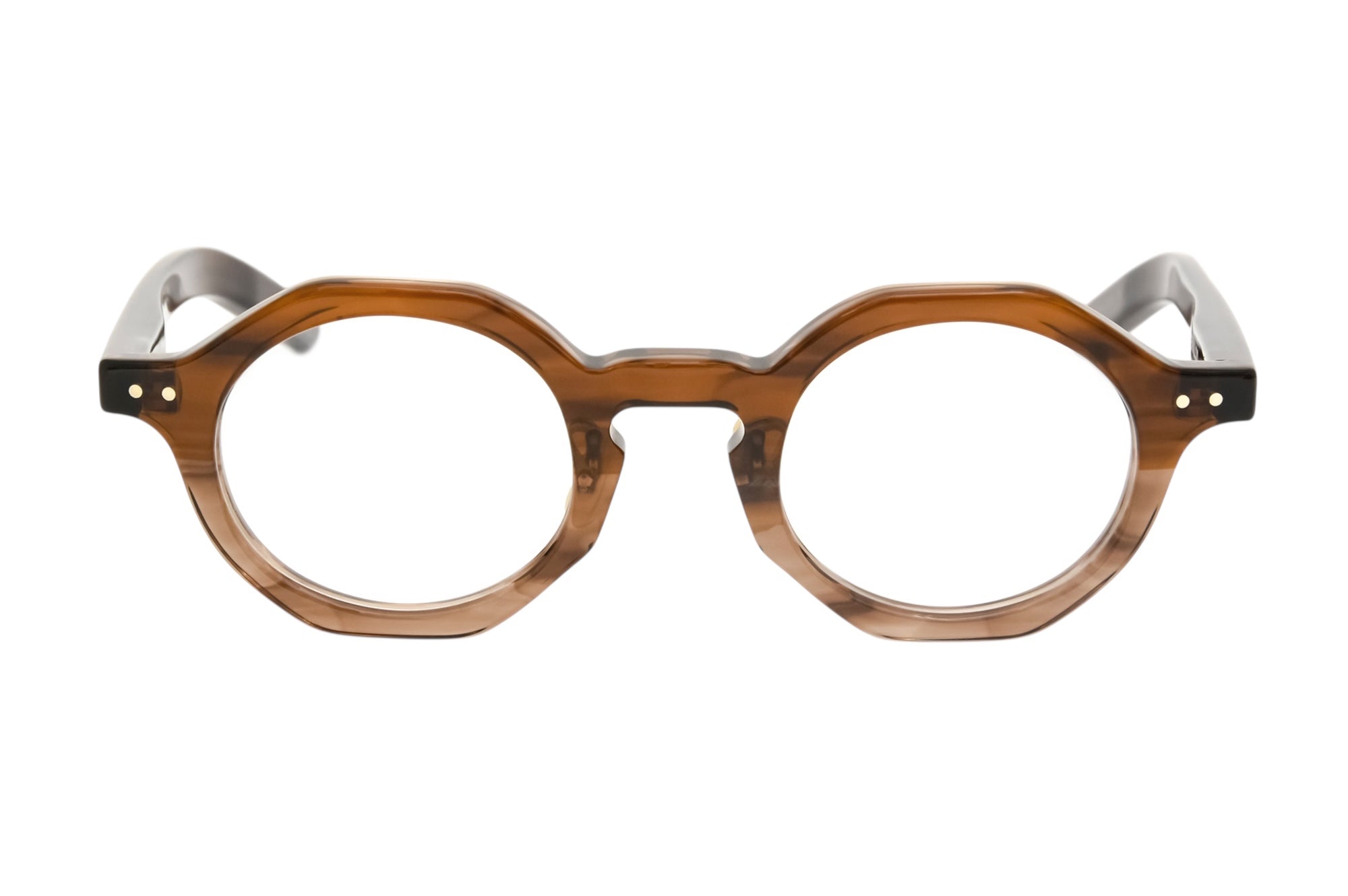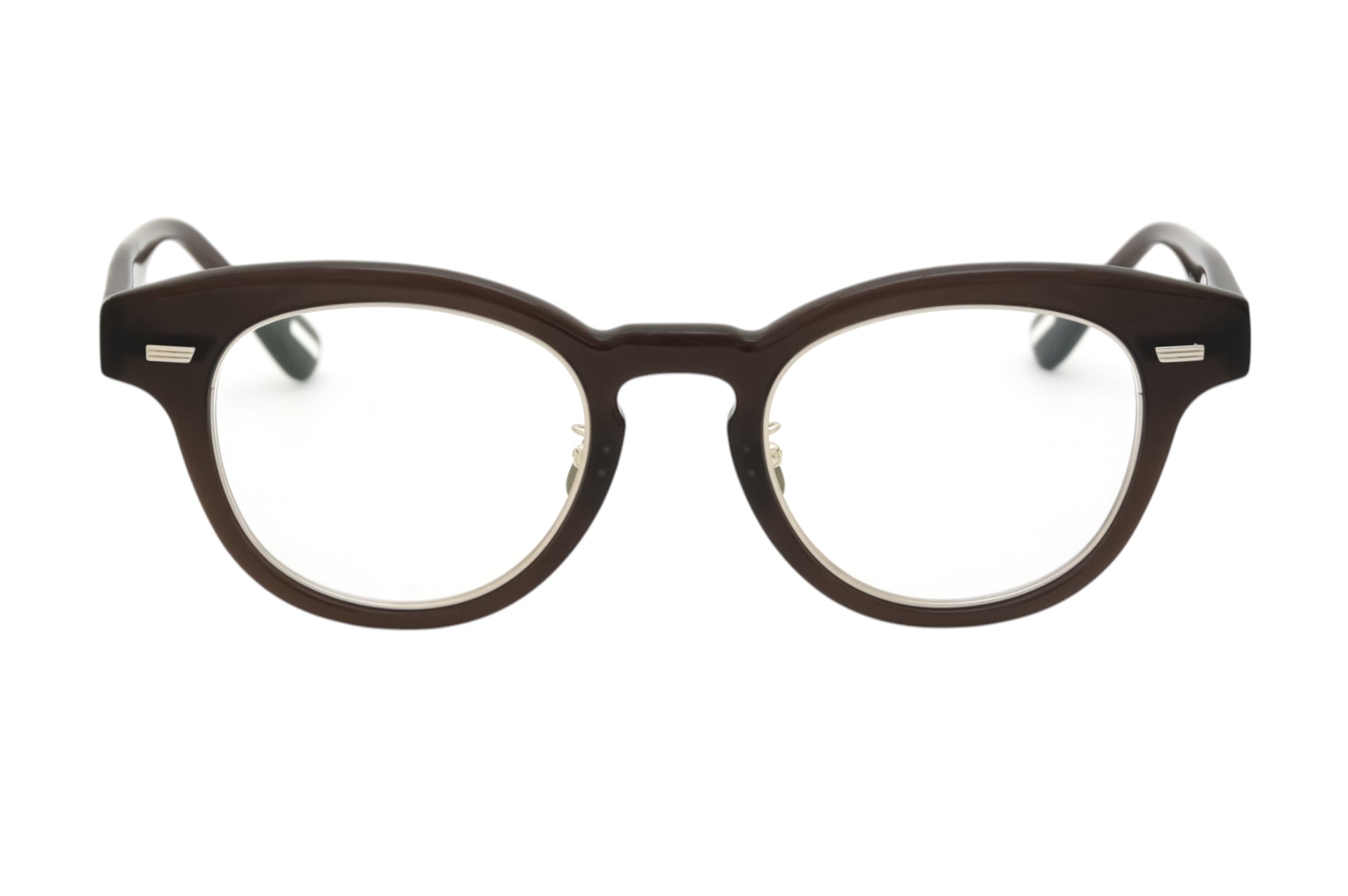 厚めの生地感や天地幅のあるブリッジなどが創出する無骨なイメージとK10の1PINや精緻な設計の埋め込みカシメ丁番が持つ繊細なイメージが同居した形容しがたいユニークな存在感のモデル。
