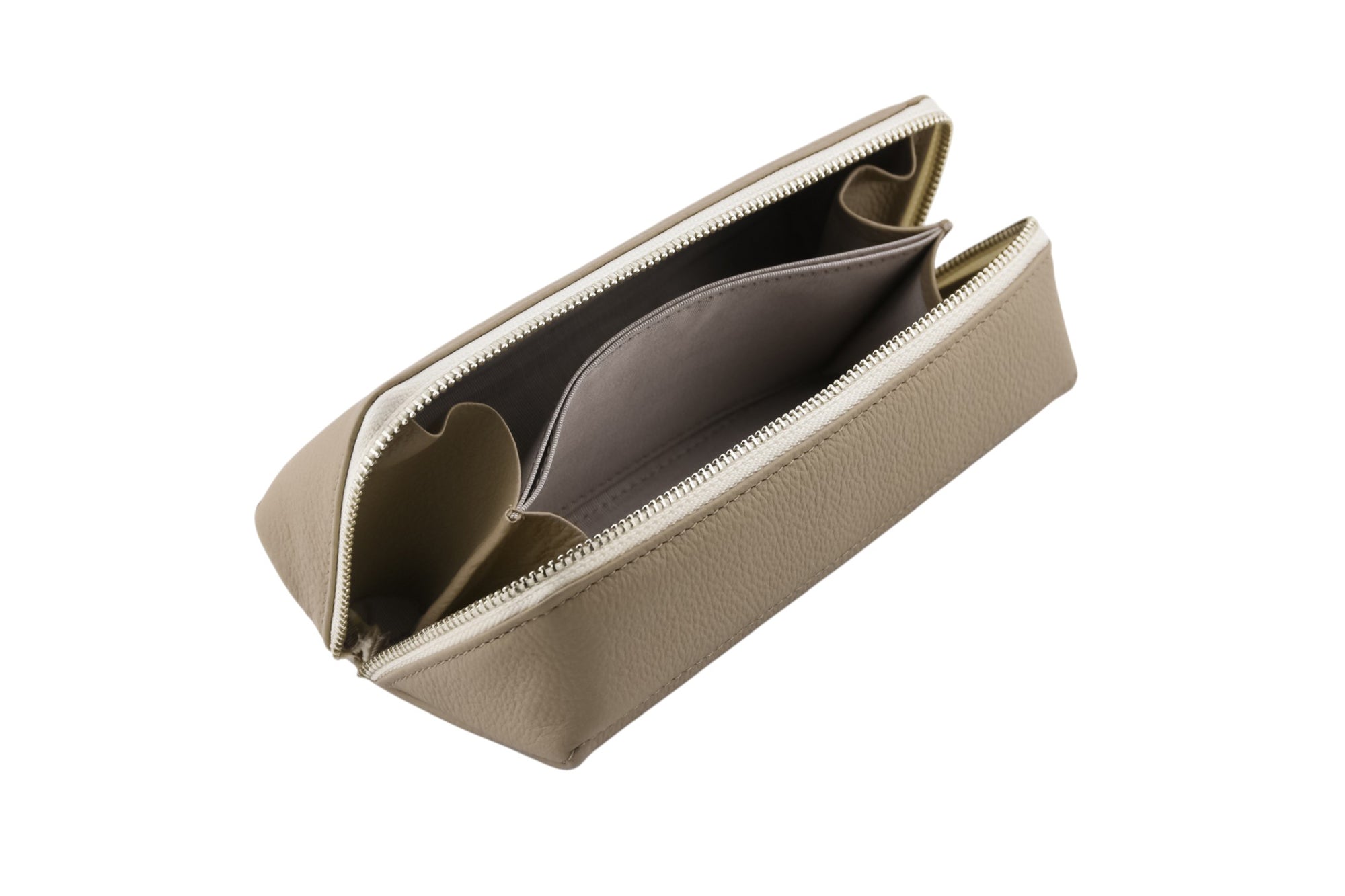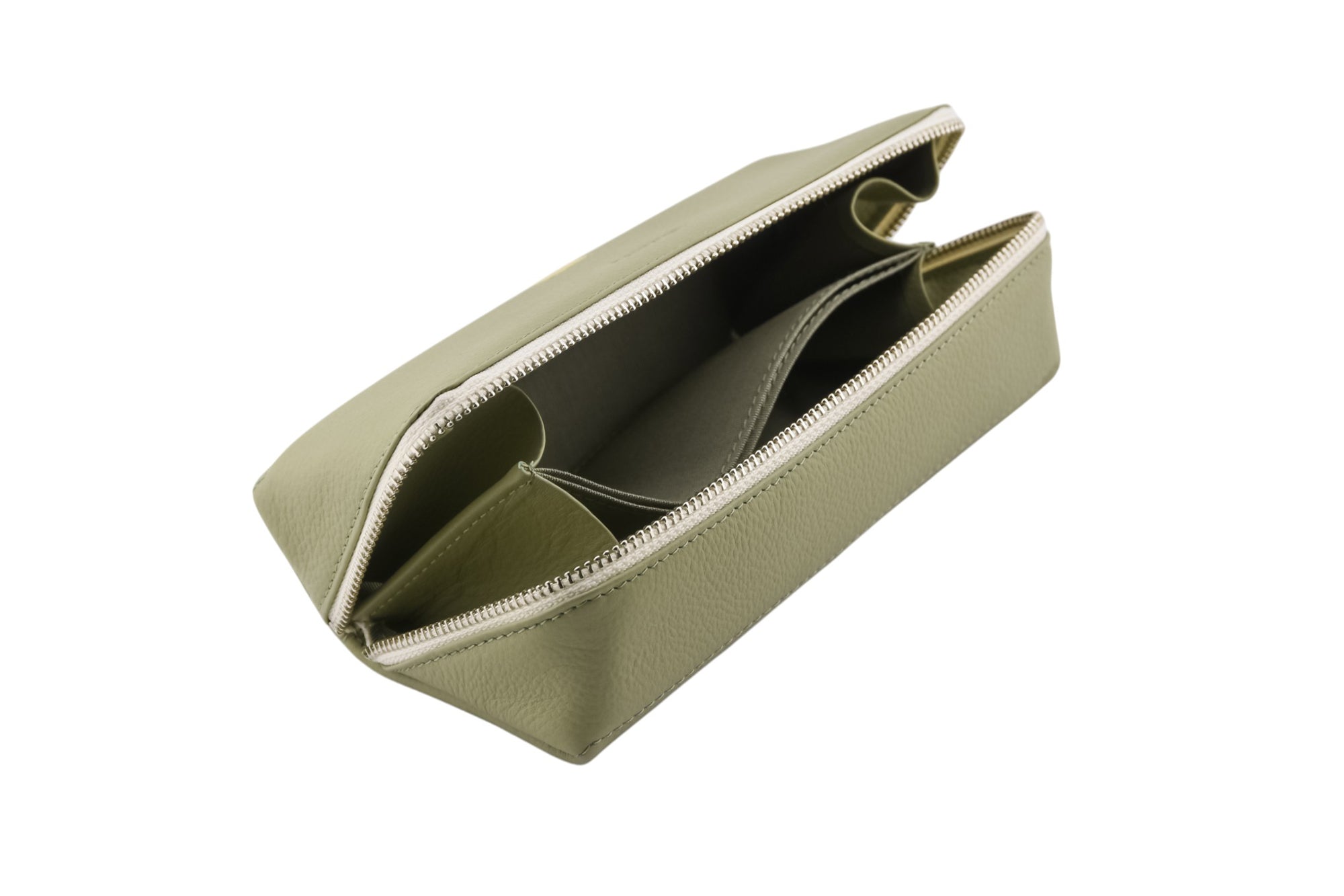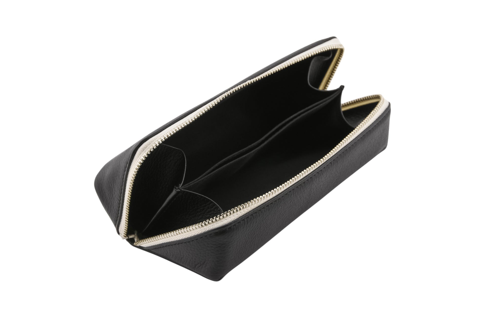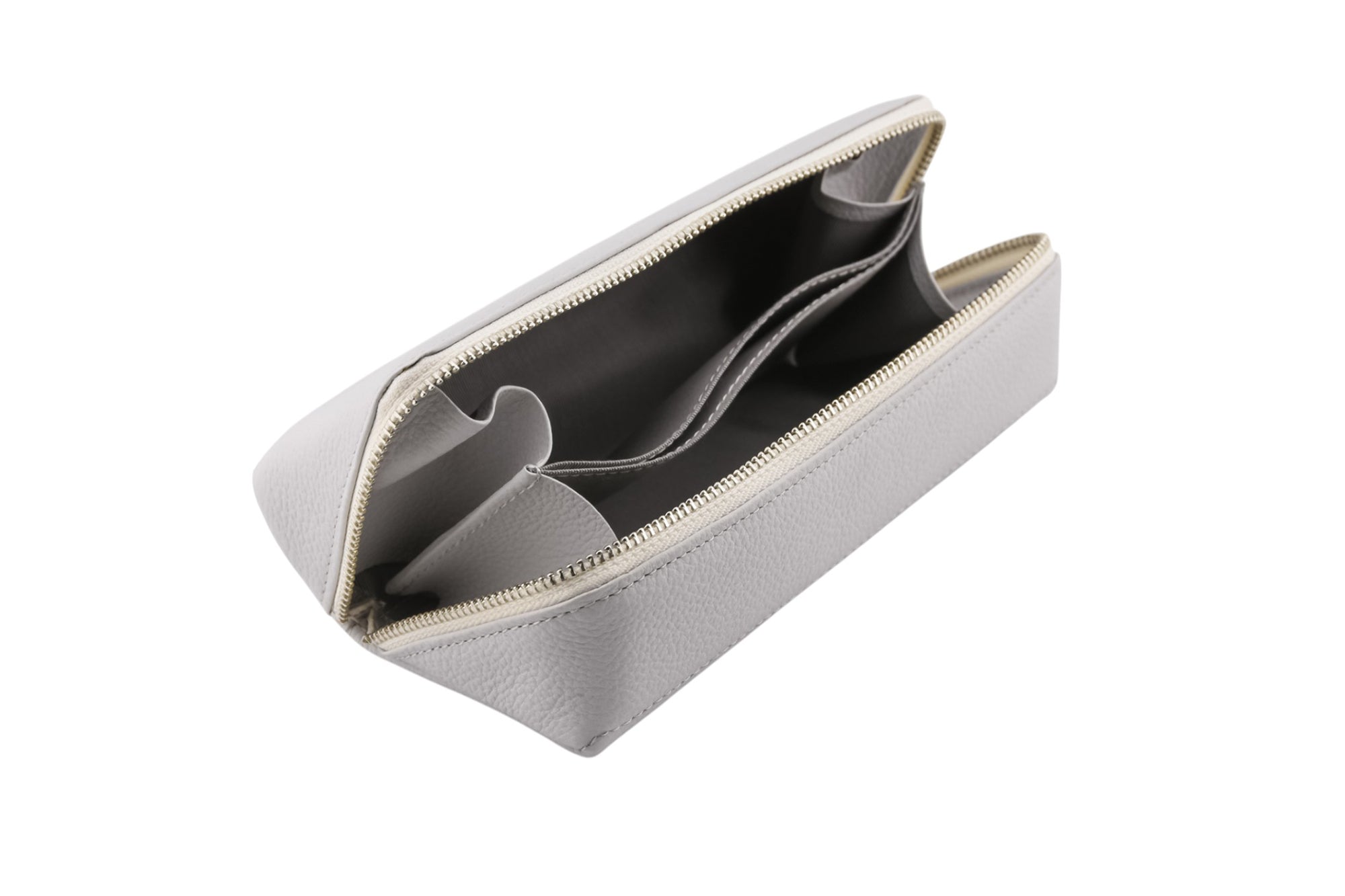 斜めに縫製したファスナーを開くと仕切りがあり、大ぶりなサングラスが2本入る設計。